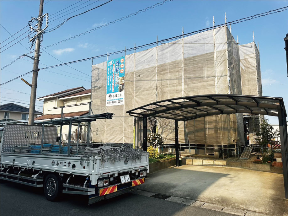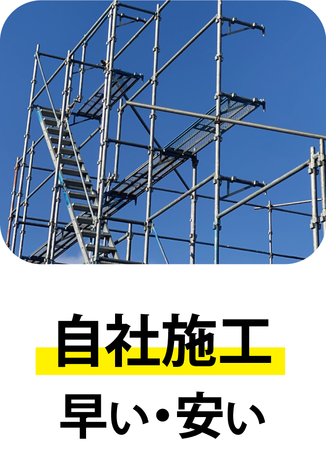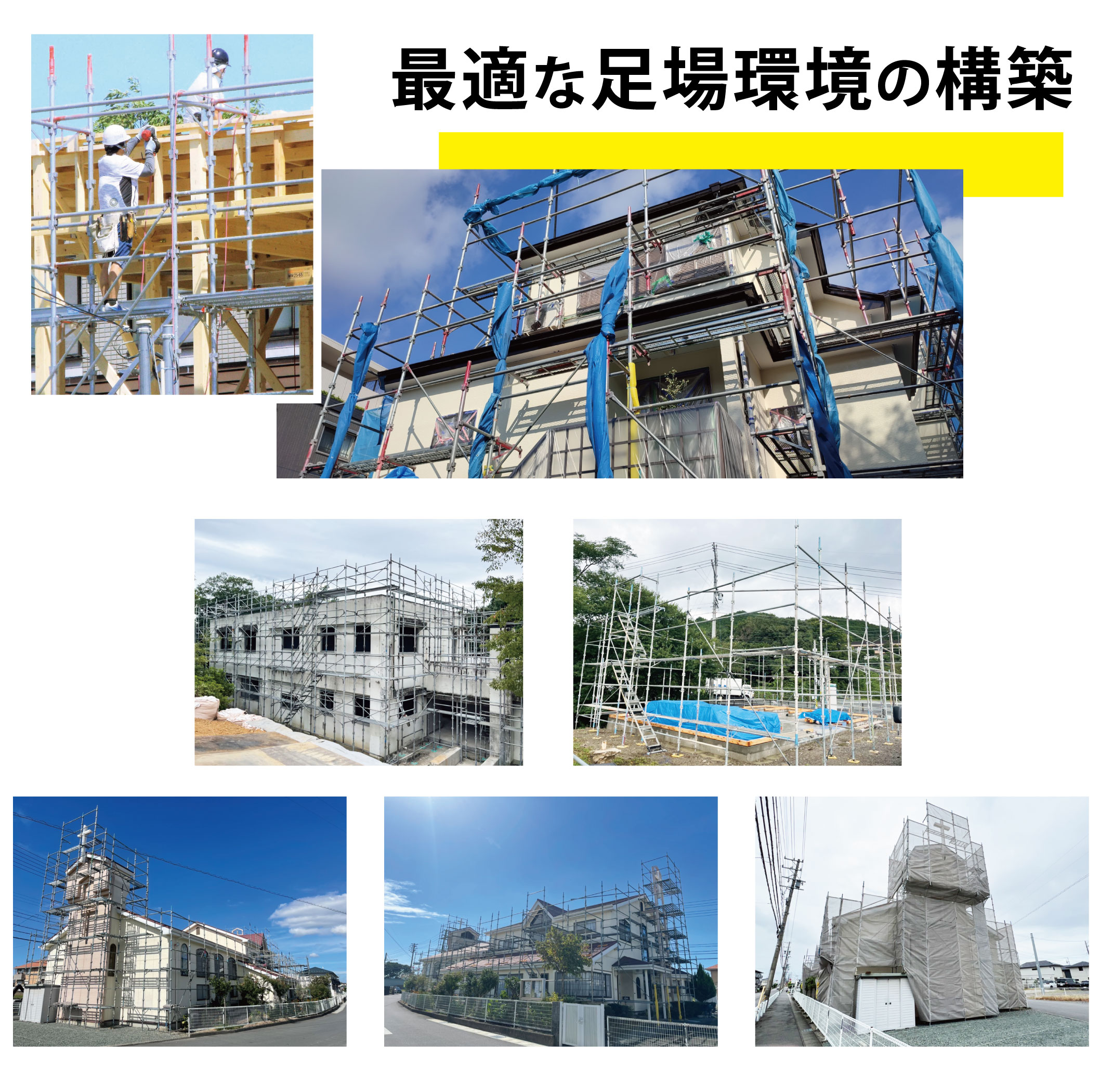 当社では住宅足場工事をメインにご依頼をお受けしています。これまでのノウハウを結集し最適な足場を提案・提供します。その他、アパートや店舗、店舗用看板など様々な用途に適した足場を組むことも可能です。
