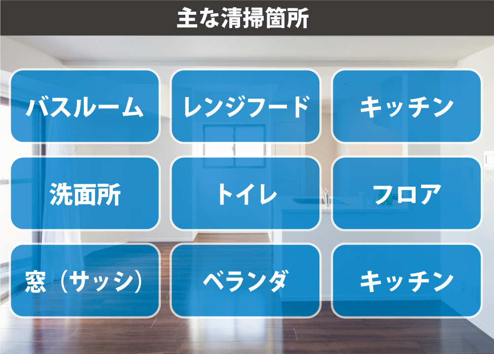 個人宅も集合住宅も屋内外問わず対応します。室内外問わず単発清掃も定期清掃もお任せ下さい。決まった箇所を重点的に清掃したり、お忙しい方には数カ所を時間で区切って行う時間制も可能です。日々の小さな箇所の清掃からお引越し時など一部屋、一軒丸々まとめてお受けもします。
