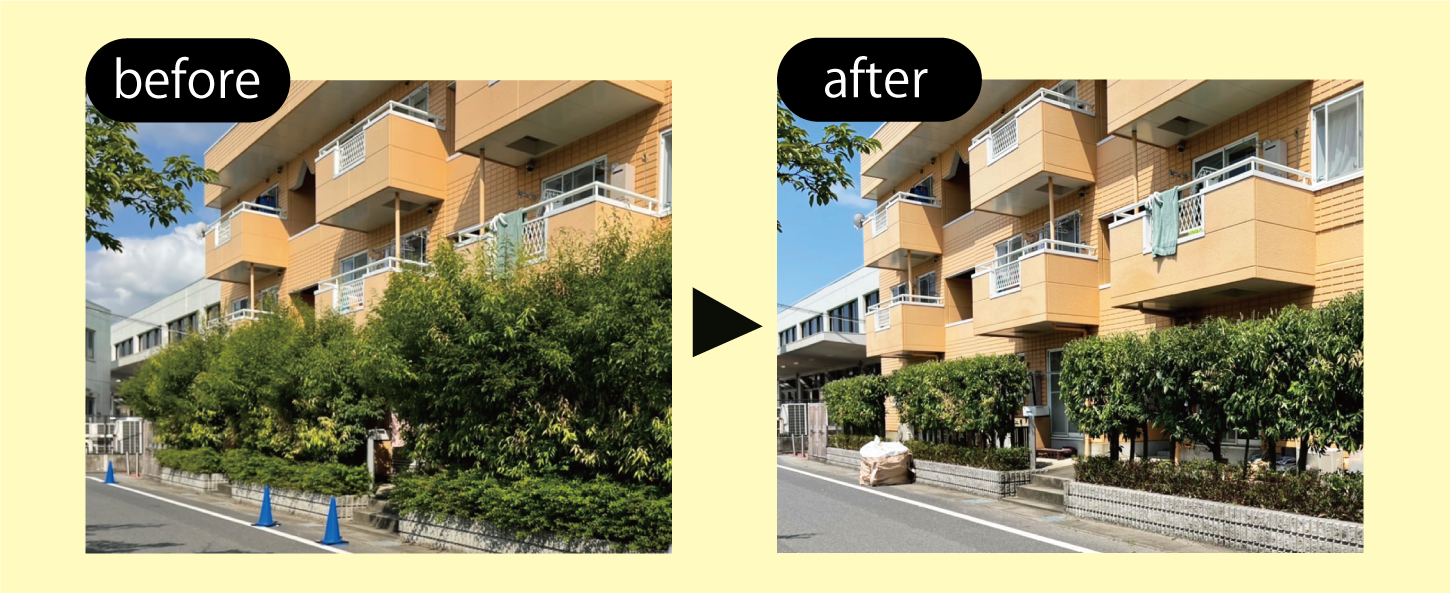 剪定は外観などのお手入れのひとつで伐採は不要な枝木を撤去する手段になります。伸びた枝葉が境界線を越えて隣家にはみ出したり、道路にはみ出て通行の妨げになるなどのトラブルを避けるためにも、定期的な作業をお勧めします。